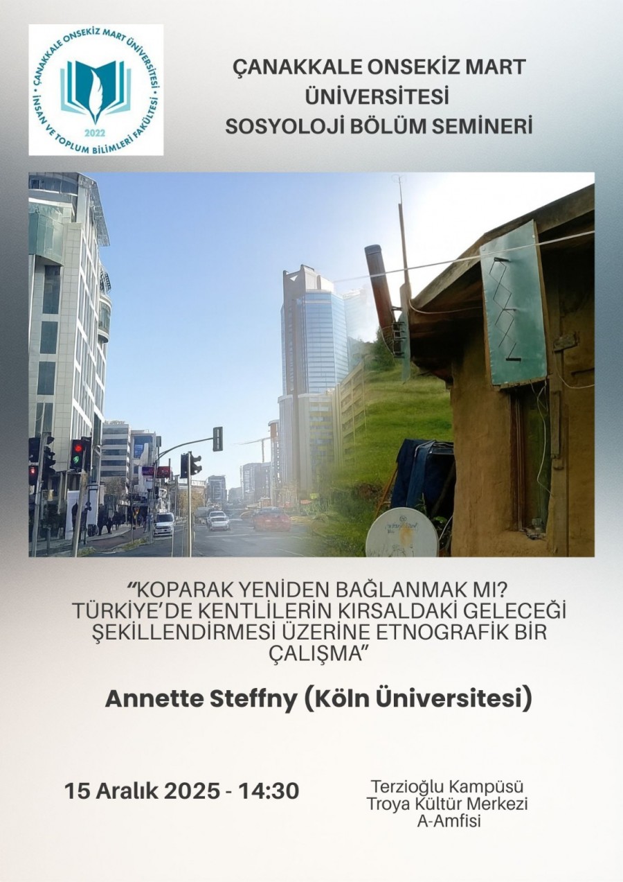 Sosyoloji Bölümü olarak bu ay, Türkiye’de giderek görünürleşen “kırsala dönüş” pratikleri üzerine yürüttüğü etnografik çalışmasını dinlemek ve tartışmak üzere Köln Üniversitesi’nden Annette Steffny’i ağırlıyoruz. Steffny bu araştırmada, büyük şehirlerden ayrılarak Türkiye’nin kuzeybatısındaki kırsal bölgelere yerleşen yüksek eğitimli bireylerin göç sonrası gündelik yaşamlarını ve kent ile kır arasında alternatif bir hayat kurma arayışlarını incelemektedir. On beş aylık saha araştırmasına dayanan bu çalışma, Türkiye’deki neo-kırsallık tartışmalarına güncel bir katkı sunmaktadır.